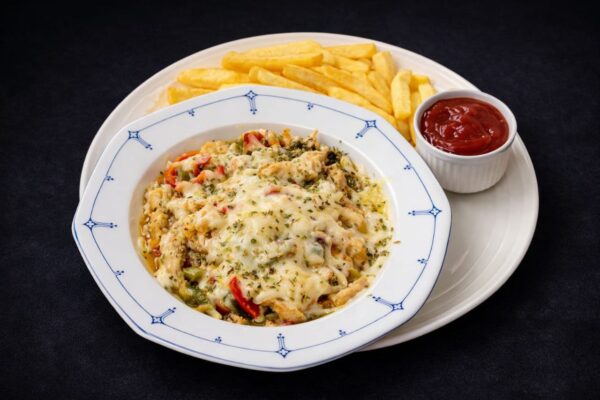 mit gebraten hähnchenbrust, Paprika, Zwiebeln, Käse, Champignons und Pommes frites