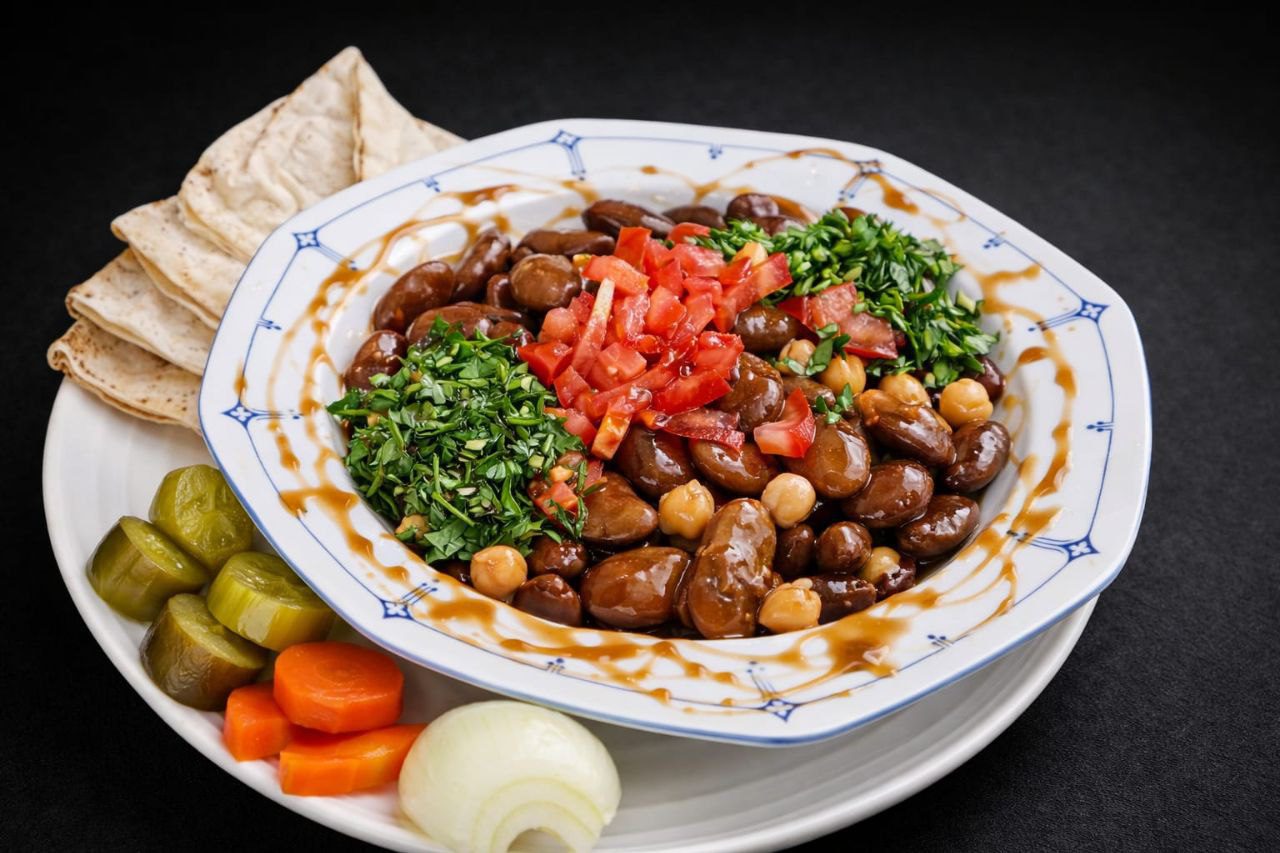 Dicke Bohnen mit Olivenöl, Zitronensaft, Tomaten, Petersilie und Knoblauch, dazu Brot