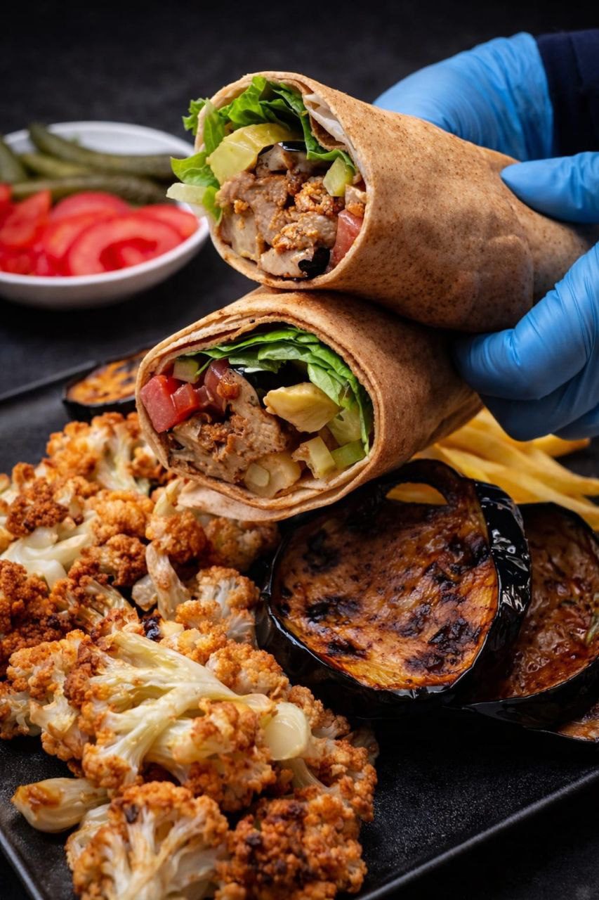 mit Hummus, Salat, gebratenen Kartoffeln, Zucchini, Aubergine und Blumenkohl
